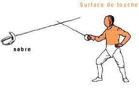 Au sabre, on observe à peu près les mêmes règles de priorité qu'au fleuret. Toutefois, cette arme est différente des deux autres puisqu'il s'agit d'une arme de taille et d'estoc, c'est à dire que la totalité de la lame peut servir à porter une touche. La zone valable est le haut du corps au dessus de la ceinture (car à l'origine le sabre est l'arme des cavaliers, et on ne devait pas blesser le cheval), elle est recouverte d'une cuirasse conductrice et le masque est lui aussi conducteur.